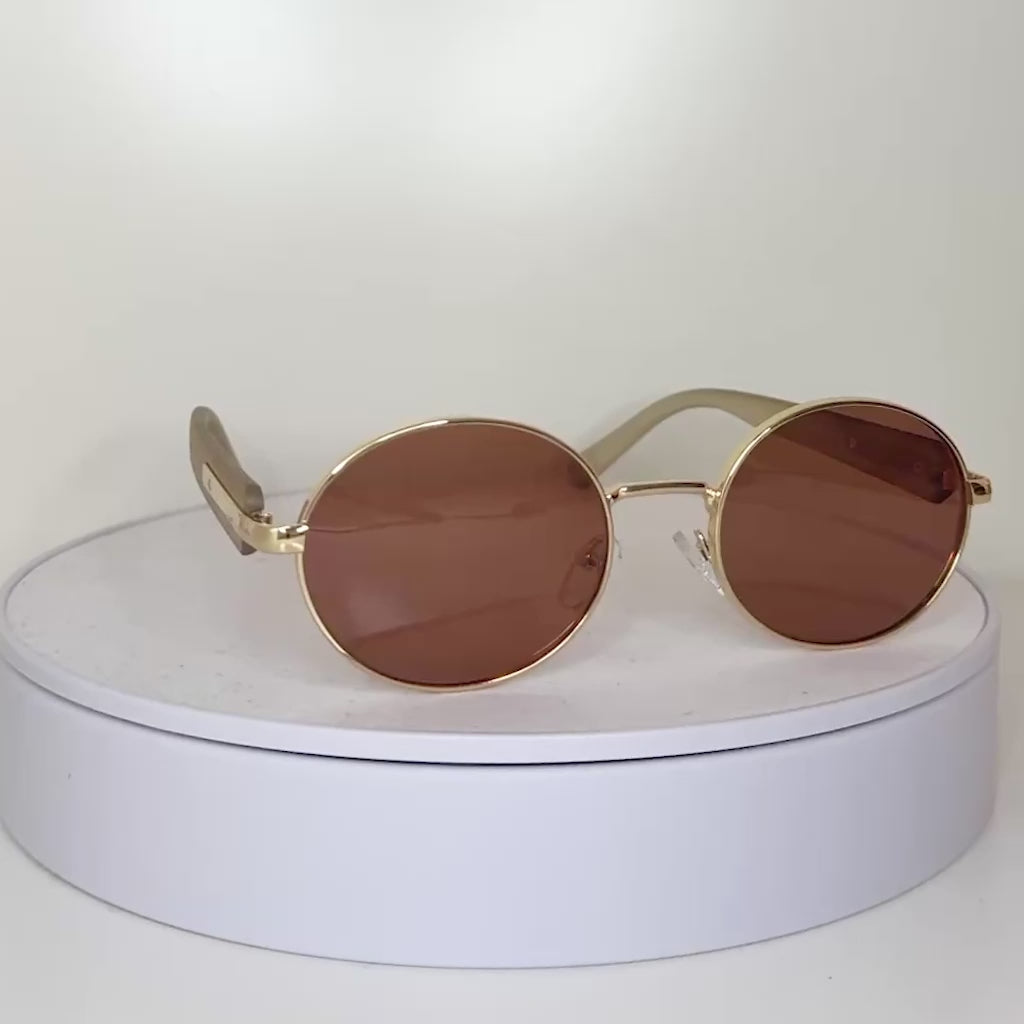 These round gold-framed sunglasses with a soft red lens are designed to radiate effortless charm. The delicate balance of luxury and femininity makes Auric a versatile statement piece — perfect for sunny strolls, brunch outings, or evening getaways.