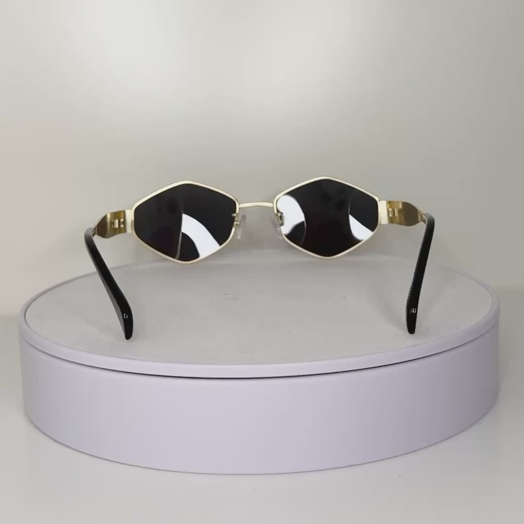 Chic, structured, and unapologetically luxe — these sunglasses redefine elegance with a sharp geometric twist. The gold metal frame and deep black lenses strike a perfect balance between bold and refined, giving off an effortlessly powerful aura. Minimal yet unmistakably high-fashion, this pair was made for women who exude quiet confidence and impeccable taste — from boardroom to rooftop brunch.