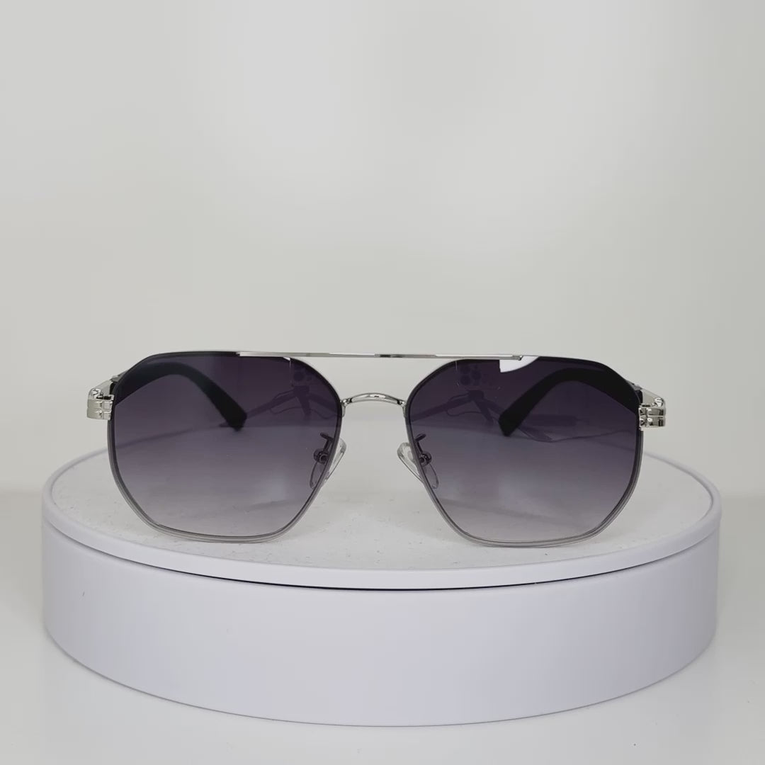 These angular silver-framed sunglasses with deep gradient violet lenses embody a fusion of modern architecture and timeless poise. The bold geometric silhouette paired with the soft fade of color creates a confident yet composed statement — perfect for daily drives, rooftop brunches, or seaside sunsets.